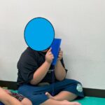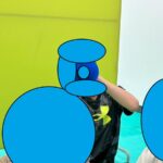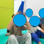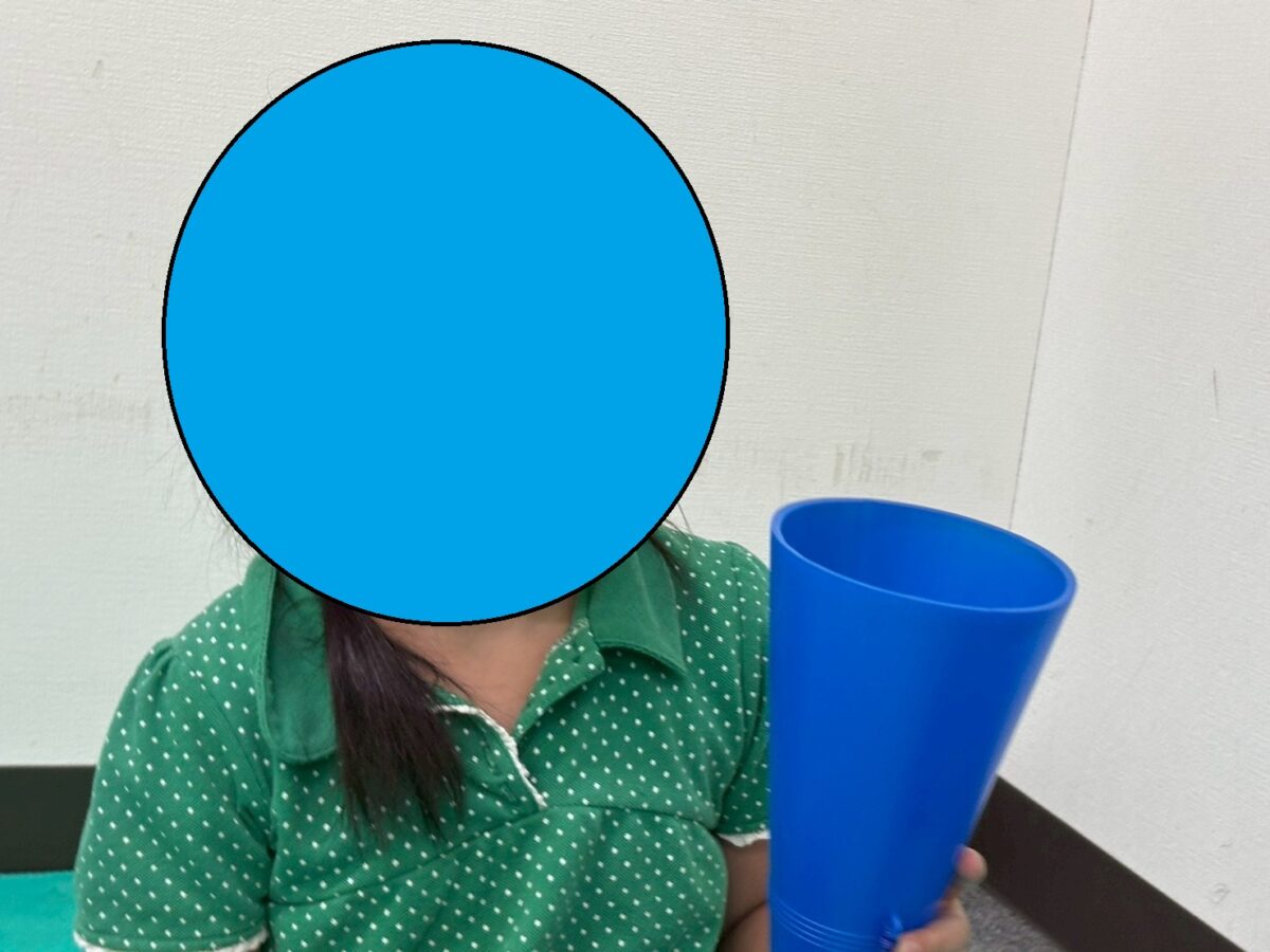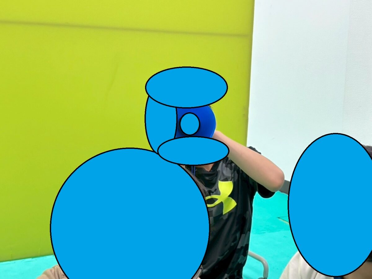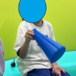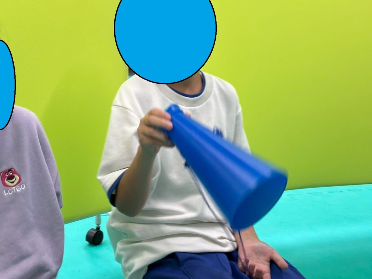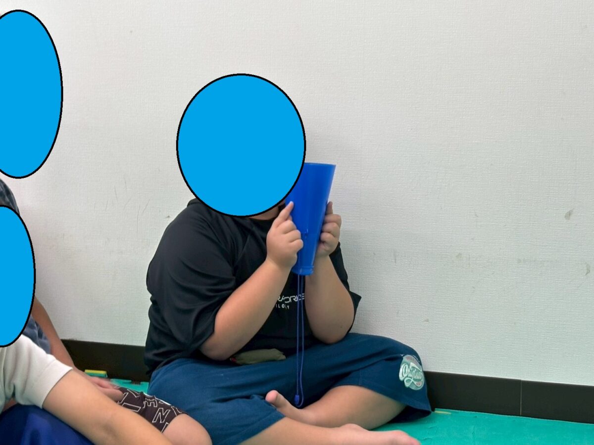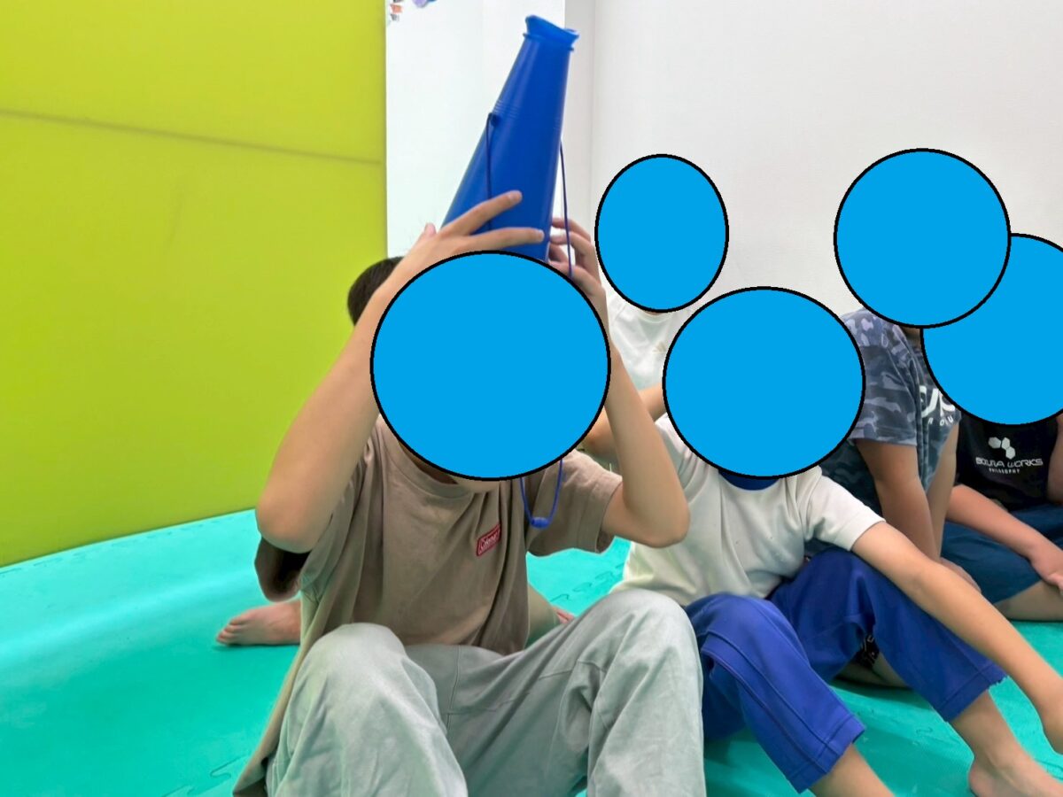 今まではフープやボール、コーンなどを利用しました。しかし、見慣れないメガホンを利用するということで簡単なお題でもどう使うのか頭が混乱…。