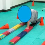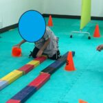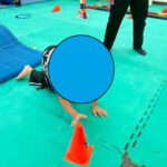 今週の運動あそびはハイハイしながら障害物を超えていく「ハイハイレース」と倒れたコーンを素早く立てていく活動の二つでした。