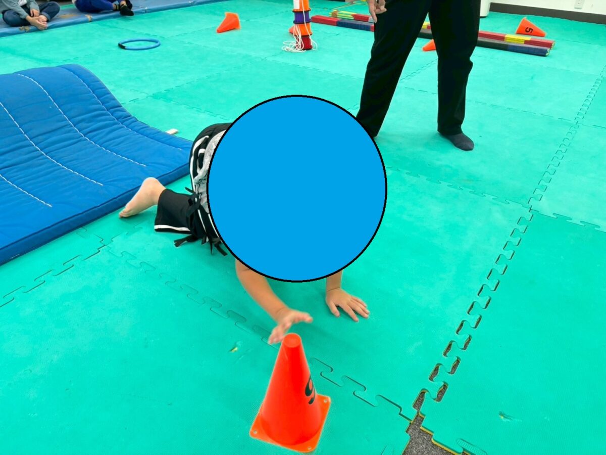 ハイハイをしながら倒れたコーンを立てていく…二つの動作が組み合わさった活動でしたが楽しくチャレンジすることが出来ていました(#^.^#)