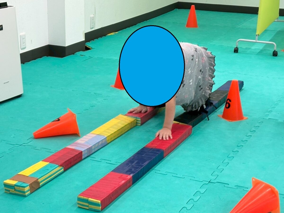 山なりになったマットや二本橋を越えつつコーンを立てていく子どもたち。ハイハイは素早く!けれどコーンはちゃんと立てられるように丁寧に…メリハリをつけて挑戦することが出来ていました。