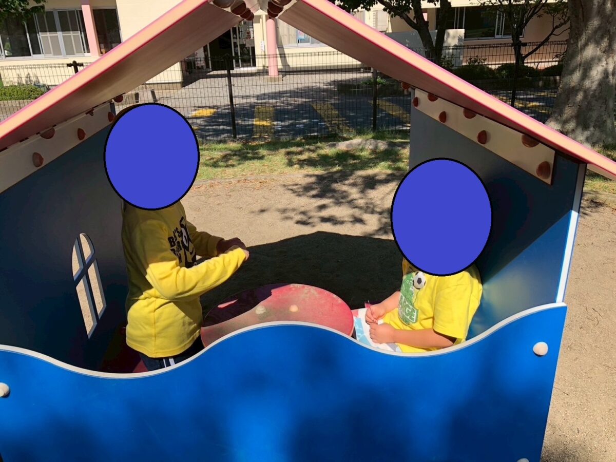 小さなお家の遊具でちょっと休憩。周囲の風景も小さな窓から見ると少し違うようで、笑顔で覗き込んでいました。