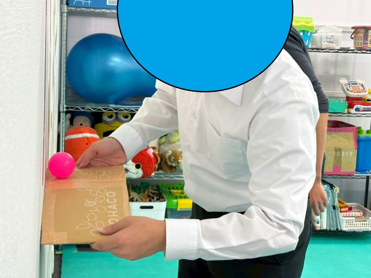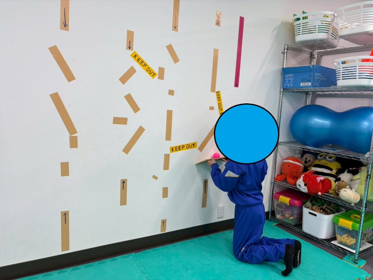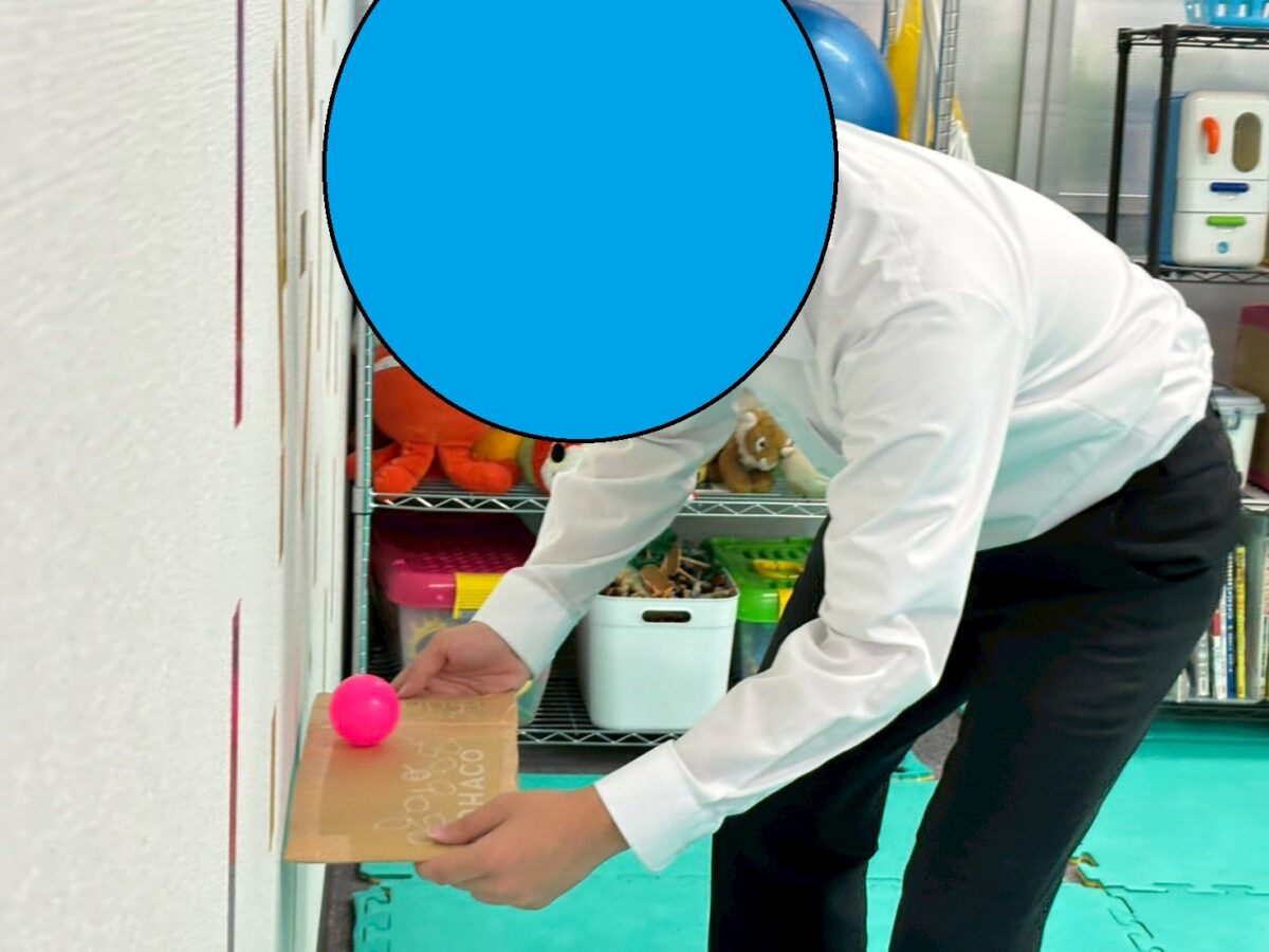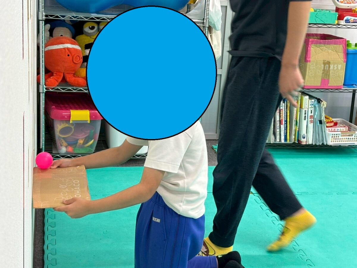 子どもたちが使用するものは段ボール板と、ボール。板の上に乗ったボールが落ちないように壁に貼られたガムテープの隙間を通過させてゴールに運ぶ活動です。
