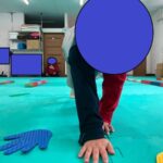 青・白・黄色のついたバーを持ち、うつぶせでボールを狙います。転がってくるボールも青・白・黄色。転がってきたボールと同じ色の箇所を使ってボールを打ち返す、というわけです。