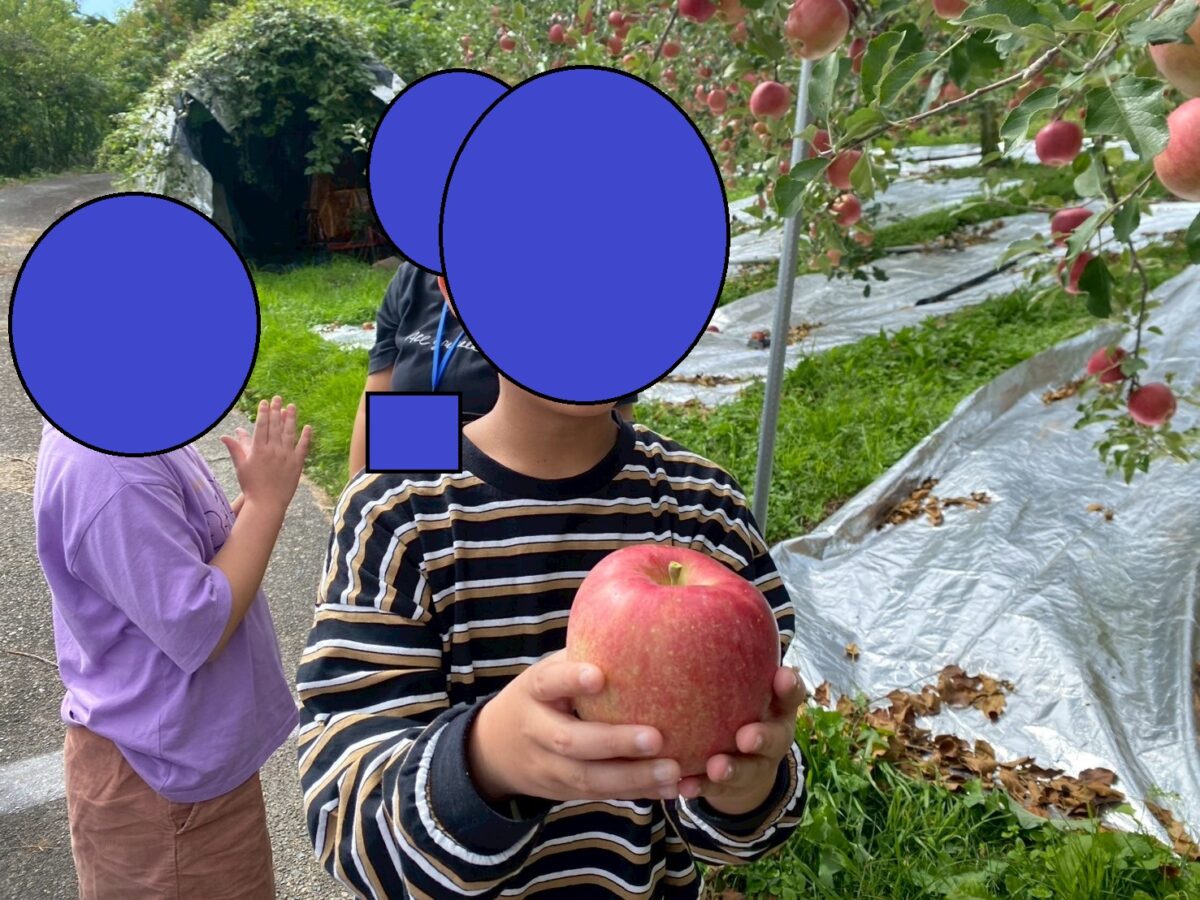今日収穫したのは「シナノスイート」。スタッフの親戚のご厚意で実現した体験でした。