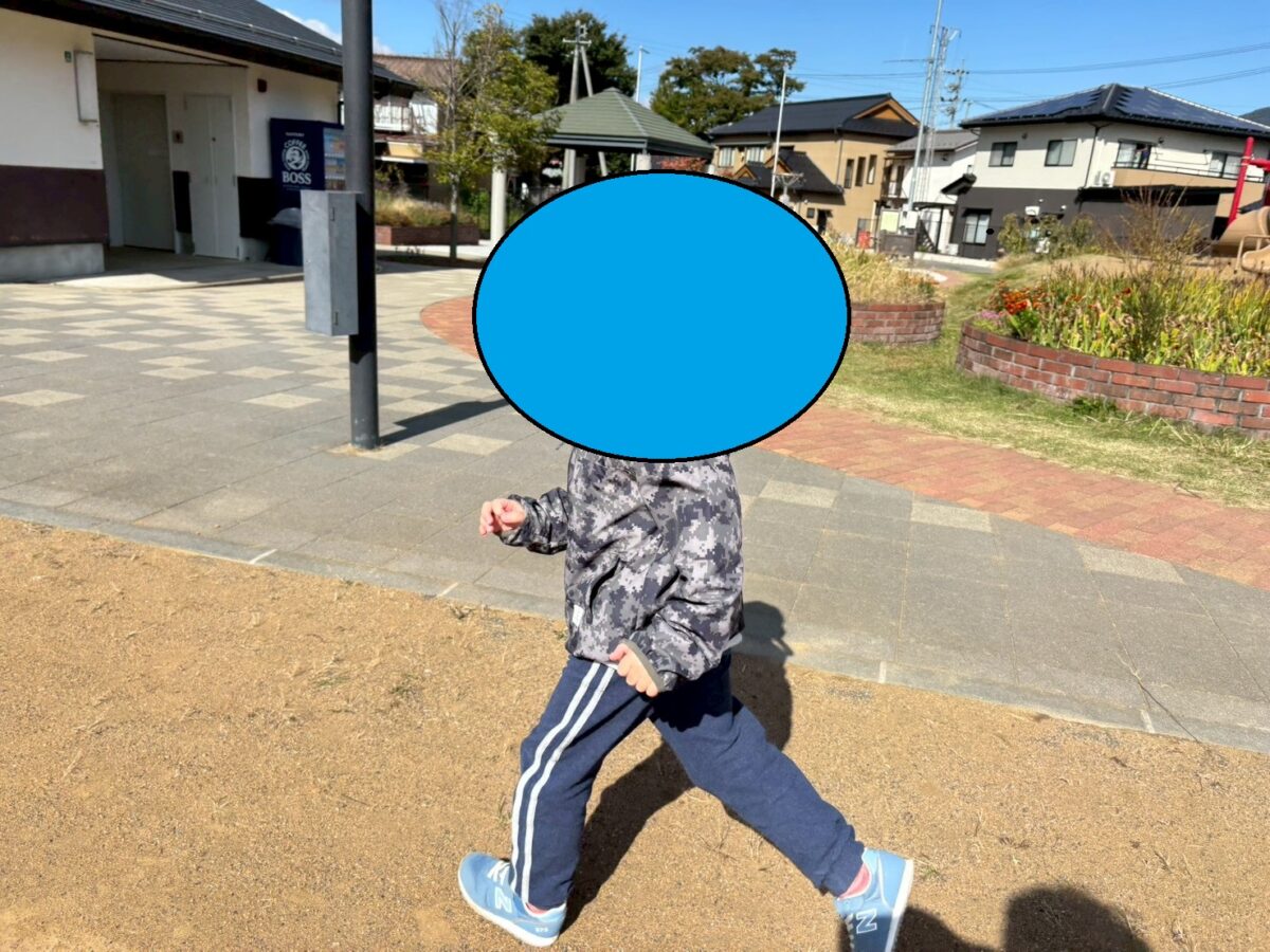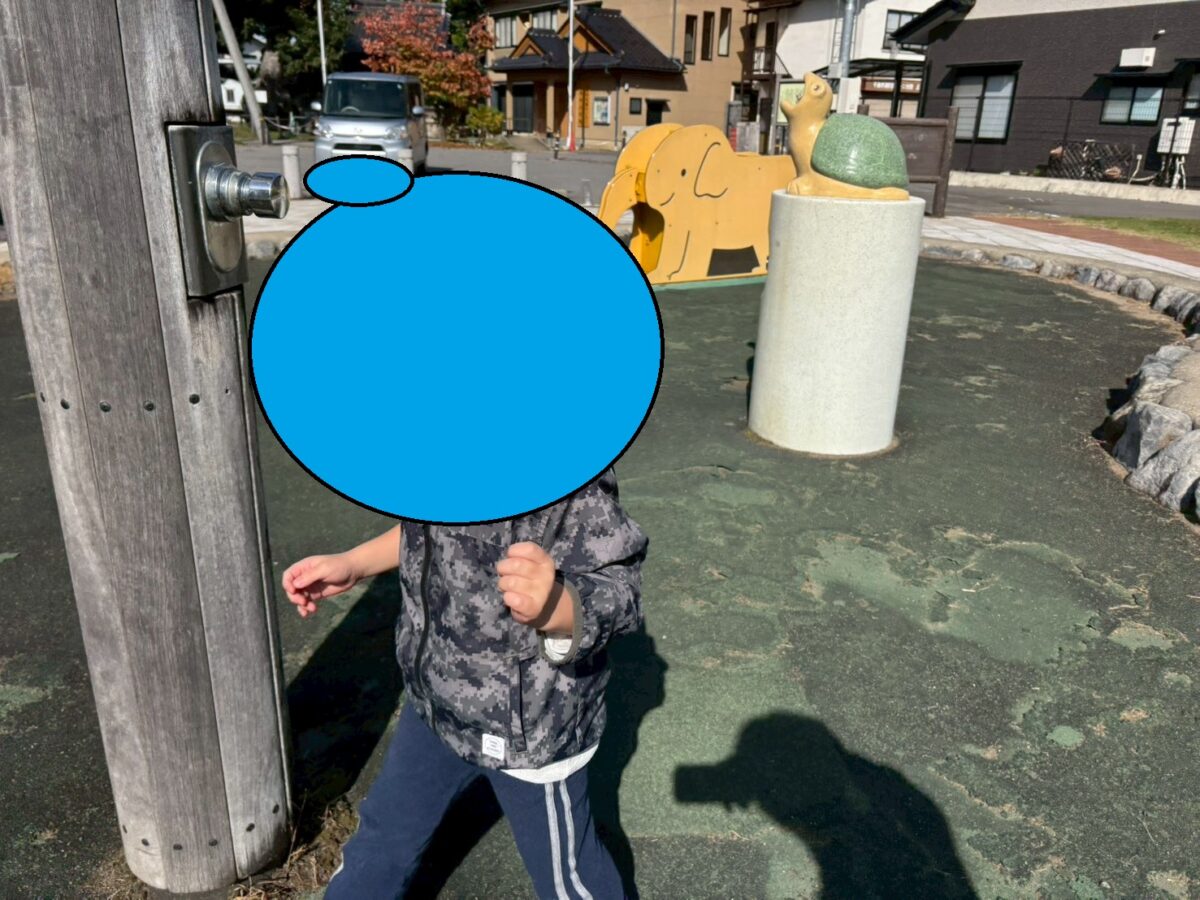噴水エリアに直行。ミストの出るポールなどに触れていましたが「もう夏終わっちゃったから水遊びなしだね…」と自分で判断し、遊具エリアへ向かいました。
