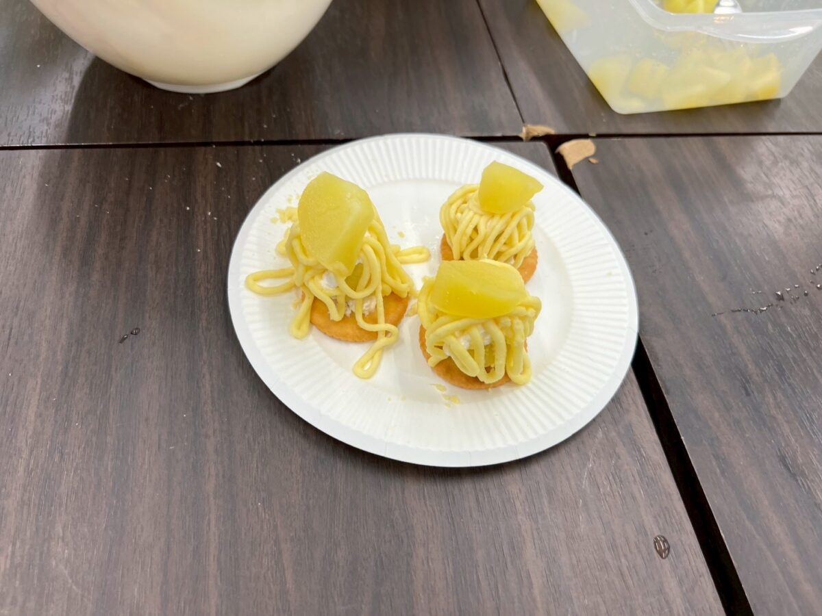 クラッカーの上に生クリーム・丸めたさつまいもペースト