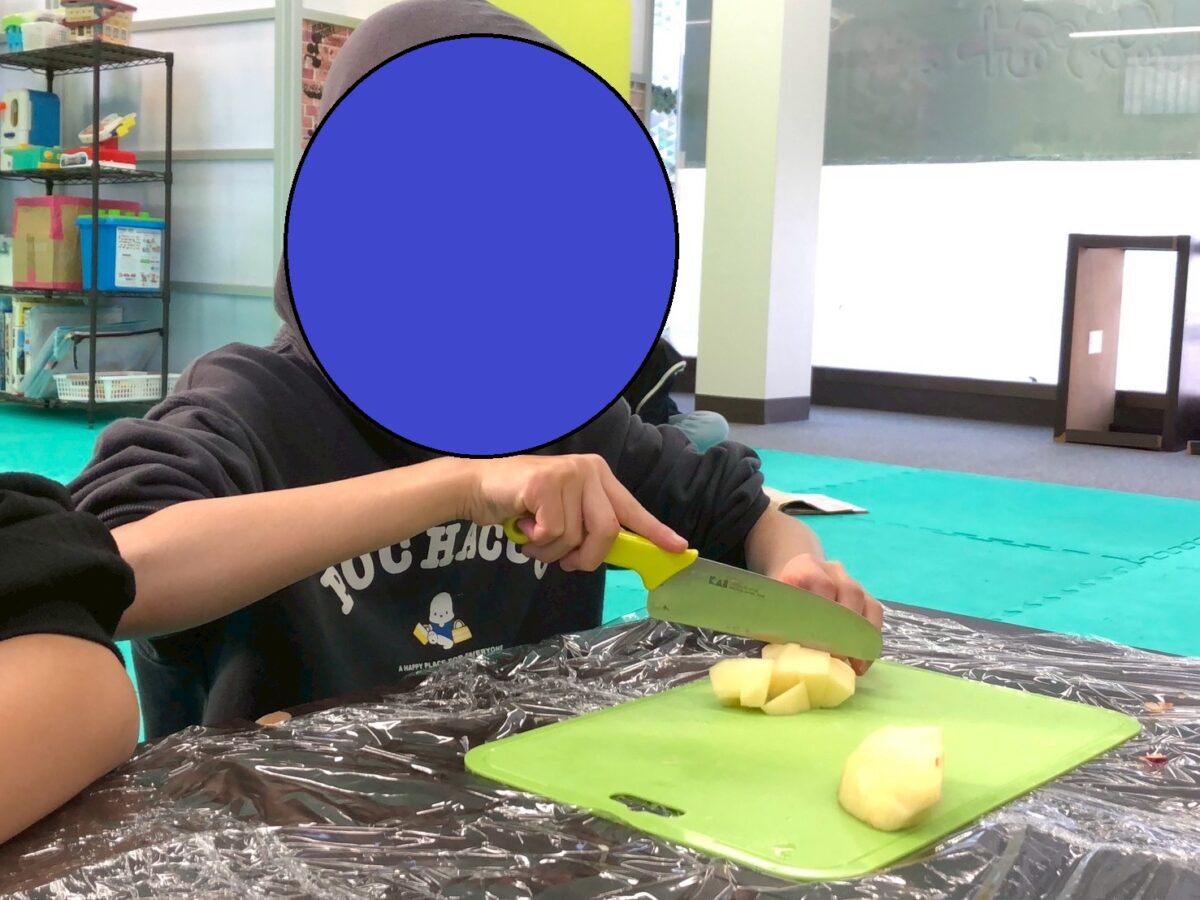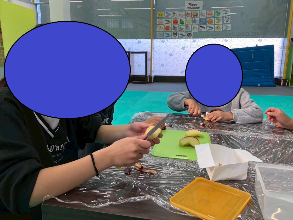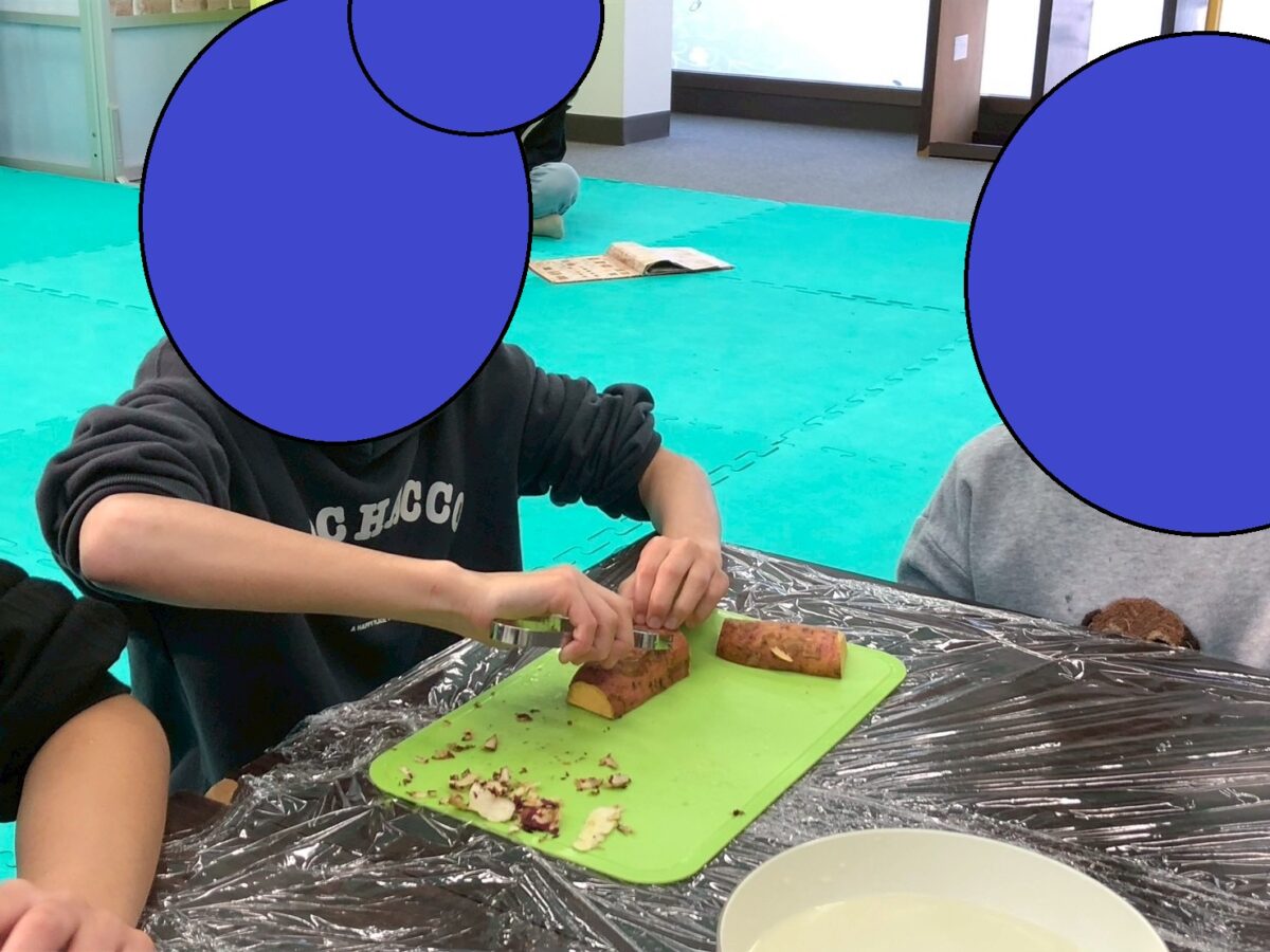 さつまもの皮をピーラーで向いたり、リンゴを切ってもらいました。