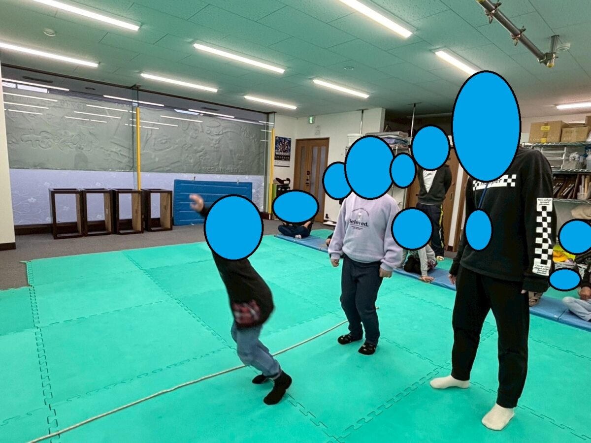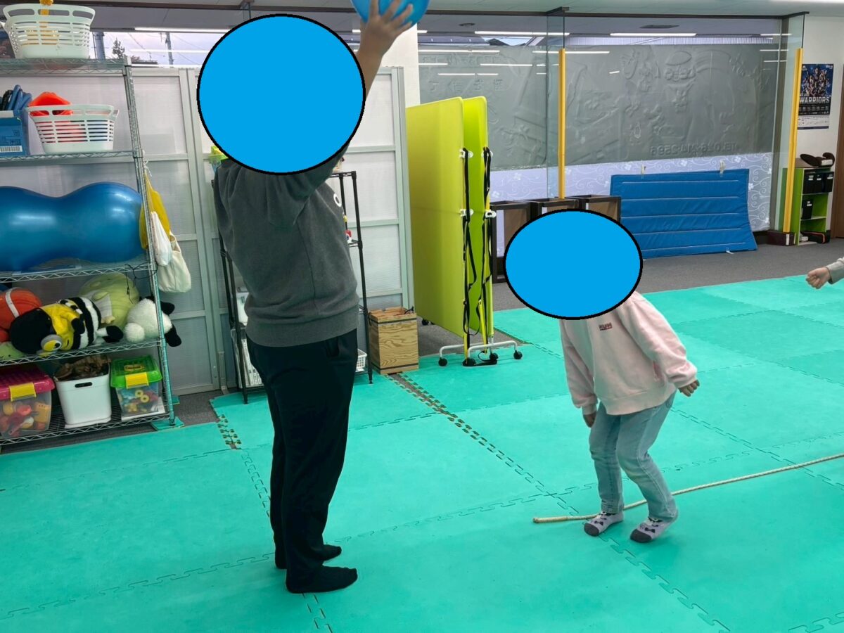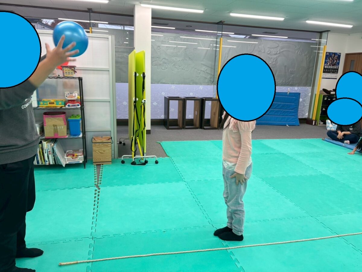 縄跳びで境界線が引かれており、スタッフの動かしたボールに合わせてどちらかへ飛んで移動します。