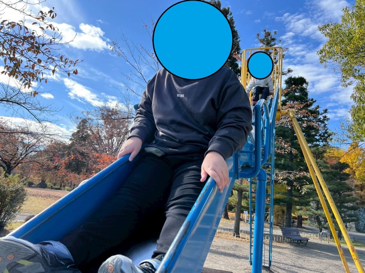 紅葉がきれいな上田城址公園に行きました。少し風がつよかったですが遊具で元気いっぱい遊びました。
