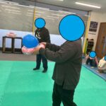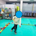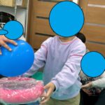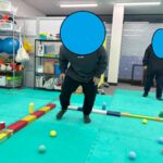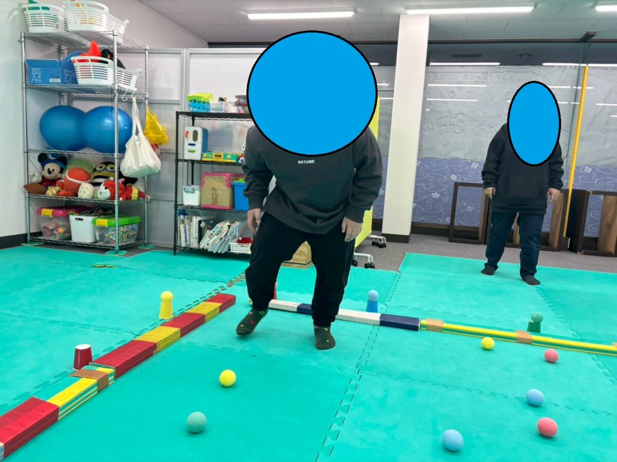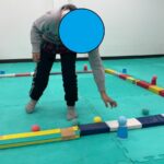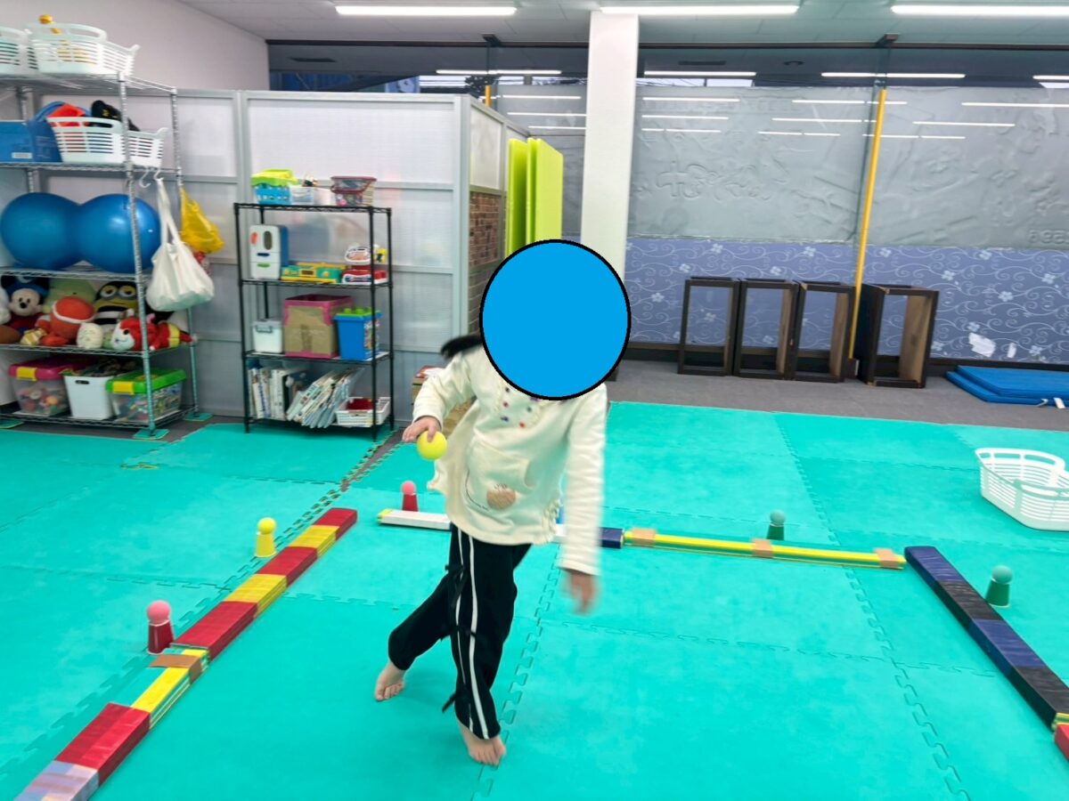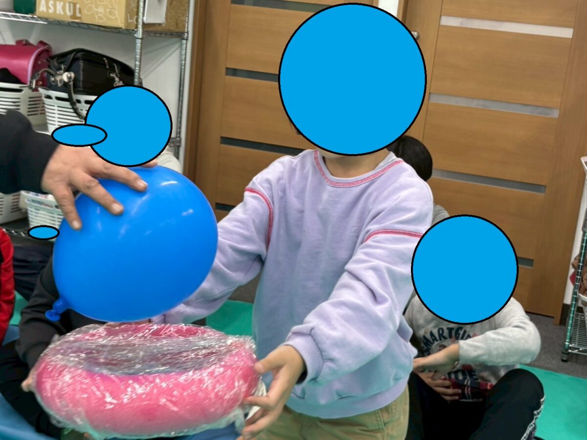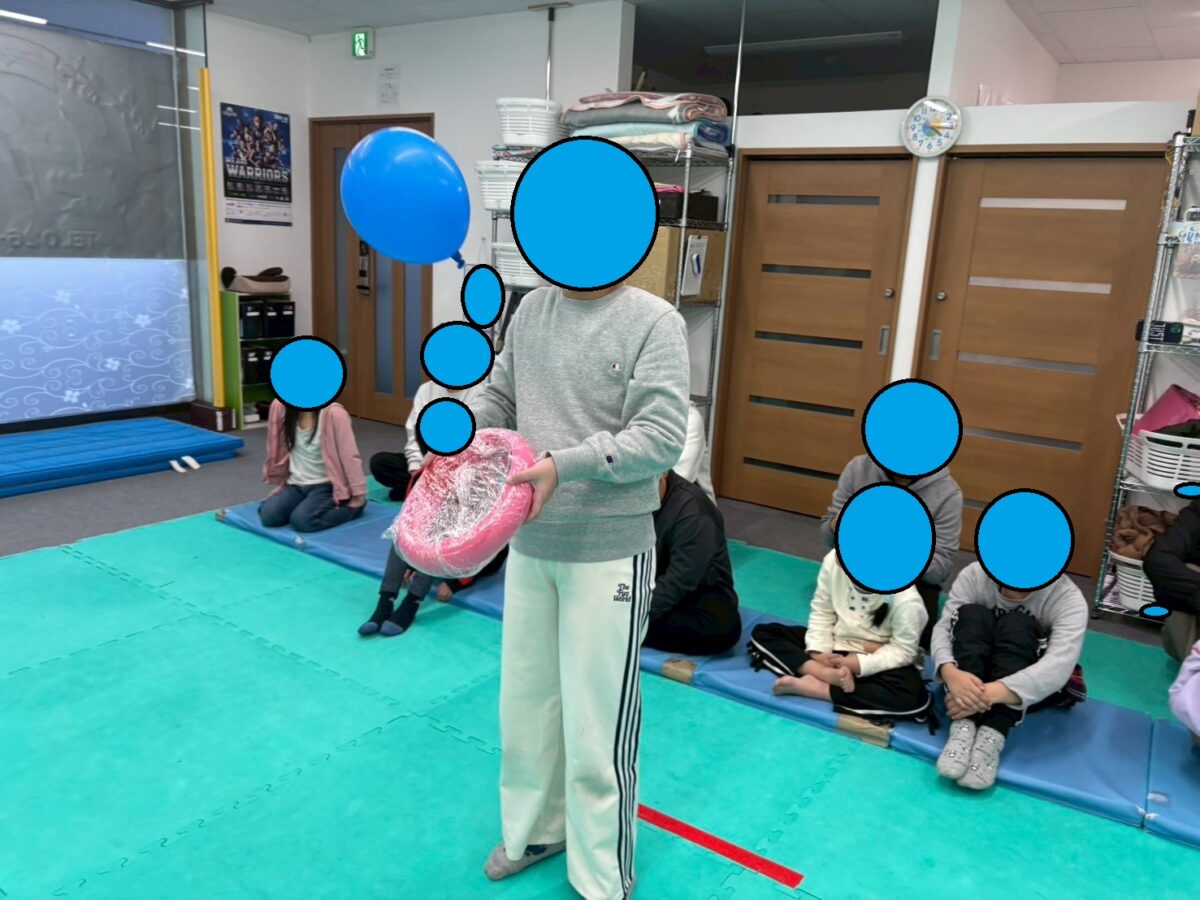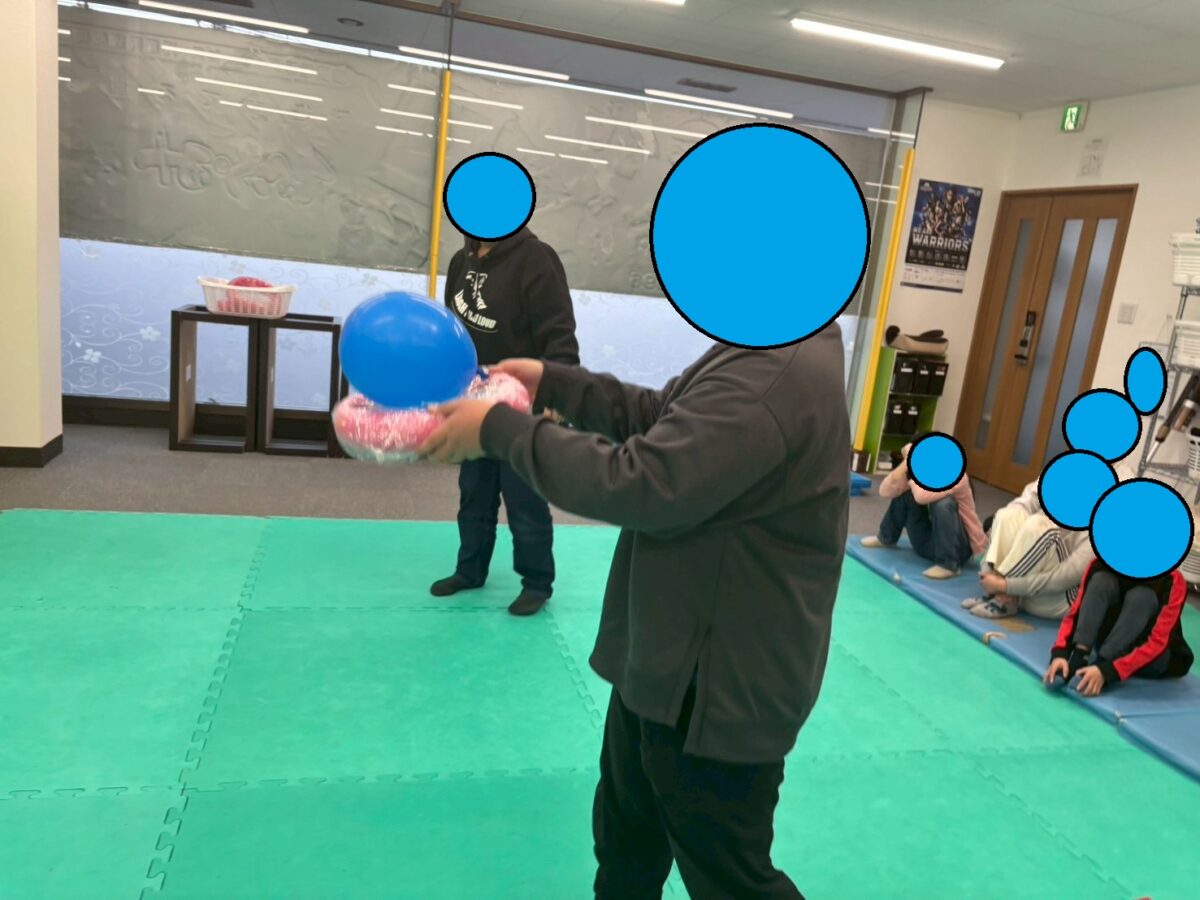 ラップの張ったラケットで風船をぽんぽんしながらグールっと回ってゴール!風船がふわふわするので、なかなかコントールが難しかったのですが、どんどん上達して風船を落とさず運ぶことができるようになりました。