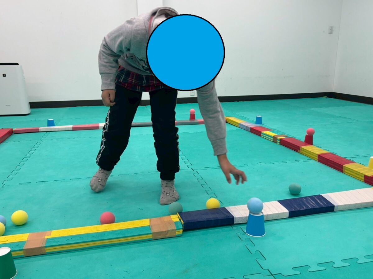 枠の中に入っているボールを外側にある紙コップの色に合わせて置いていきます。紙コップを逆さにしてあるので、コロッとボールが落ちてしまわないようにのせていきました。