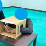 始めによ~く箱の中に入れるものを触って、感触を確かめます。視覚情報を頼りにせず、触った感触を大切に。手のひらや指先の細かな感覚が重要になってきます。