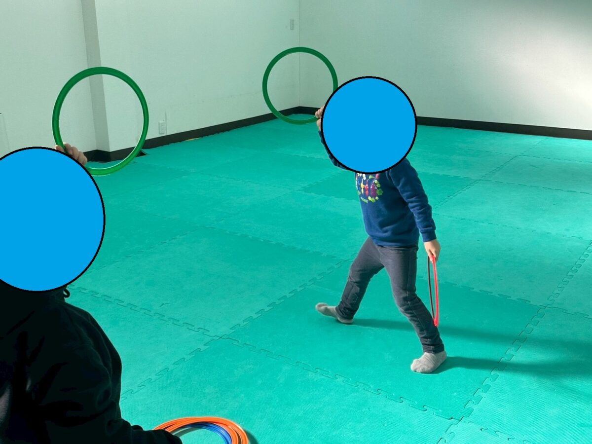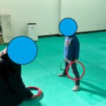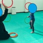 経験したことのない活動ということもあって、序盤は苦戦…。言われていない色のフープを上げたり、片方だけ上げるところを両手で上げてしまったりと。