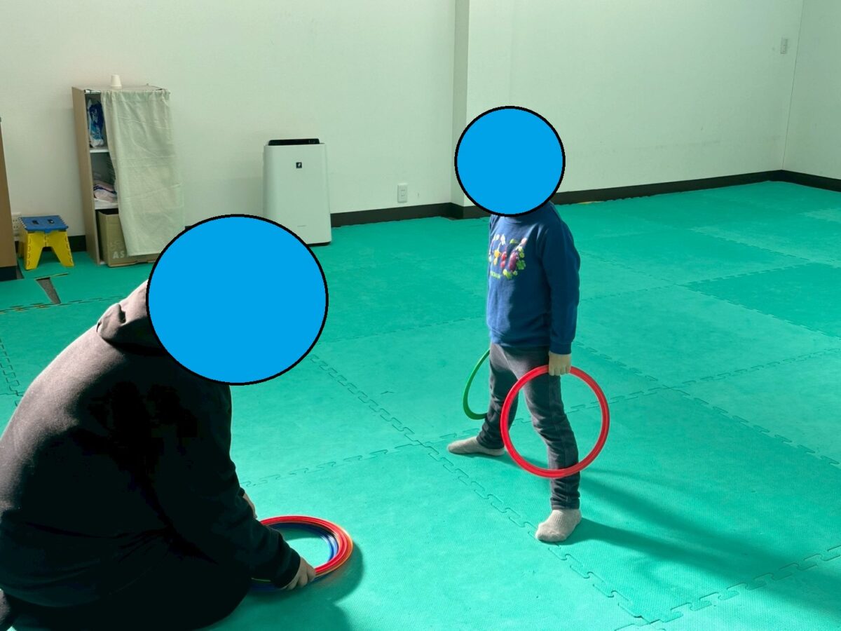 経験したことのない活動ということもあって、序盤は苦戦…。言われていない色のフープを上げたり、片方だけ上げるところを両手で上げてしまったりと。