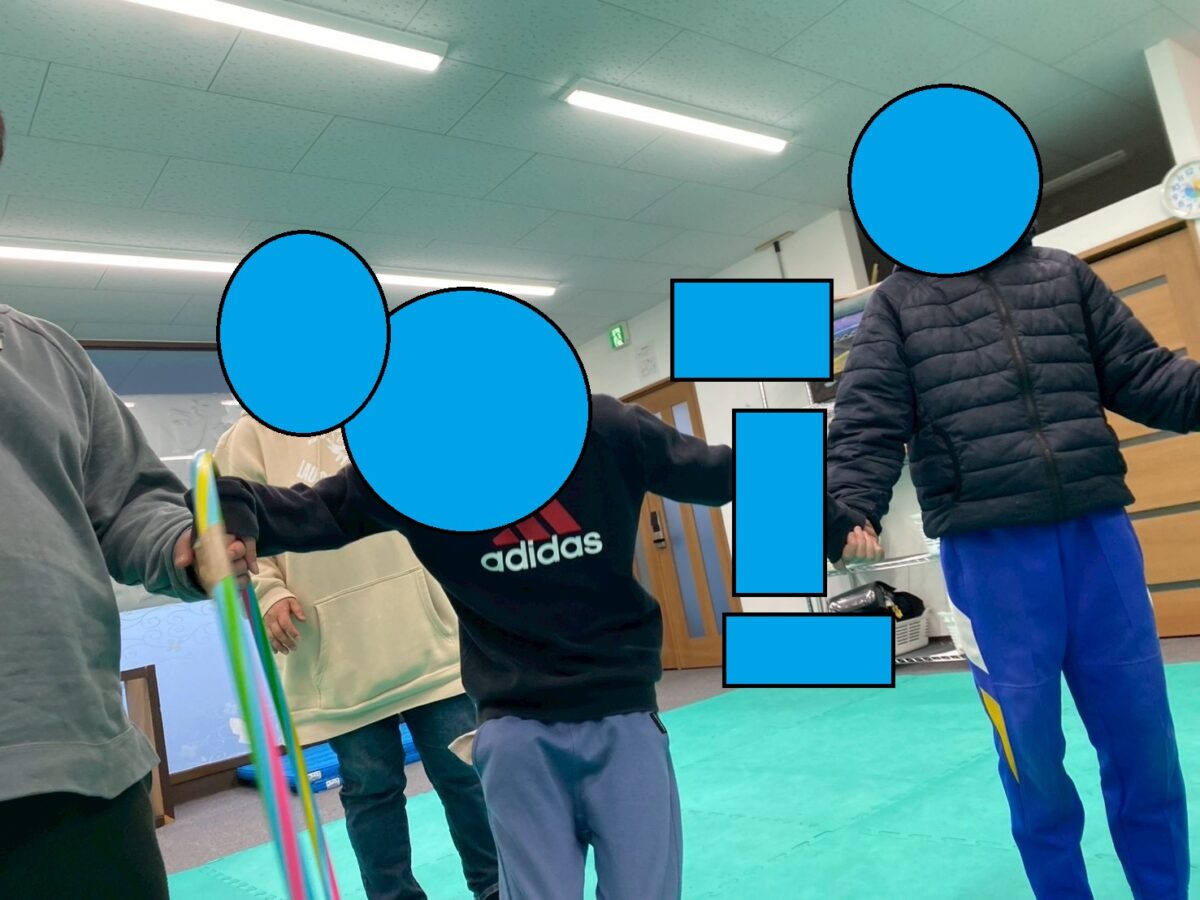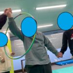 今週の運動あそびの一つとして、スタッフ/児童全員参加でフープをくぐりました
