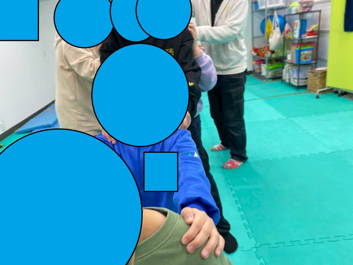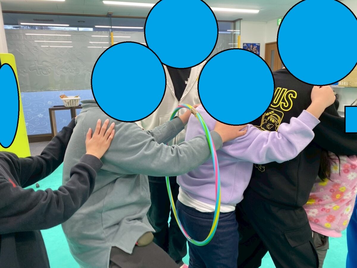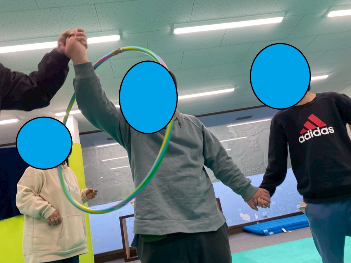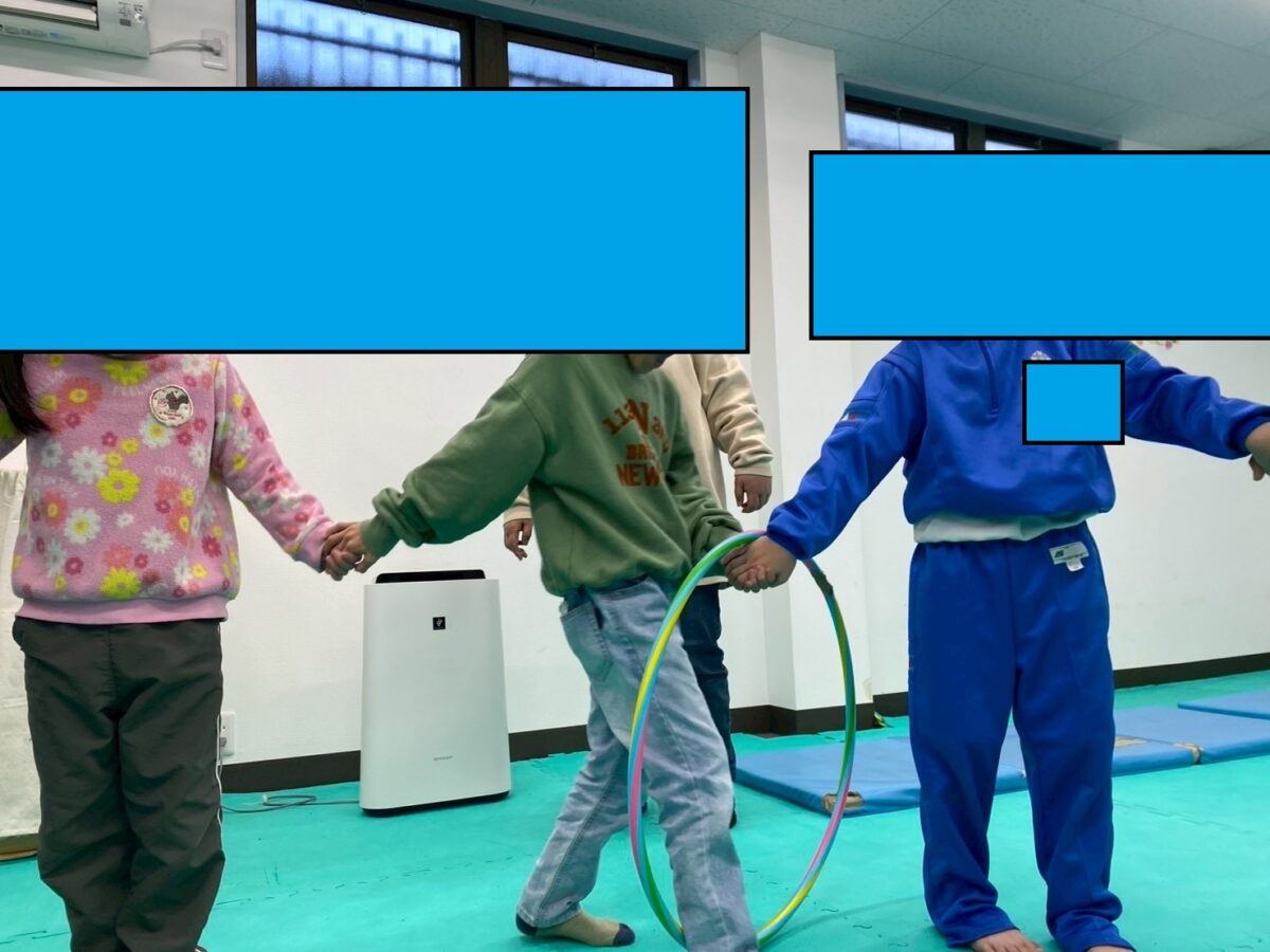 今週の運動あそびの一つとして、スタッフ/児童全員参加でフープをくぐりました