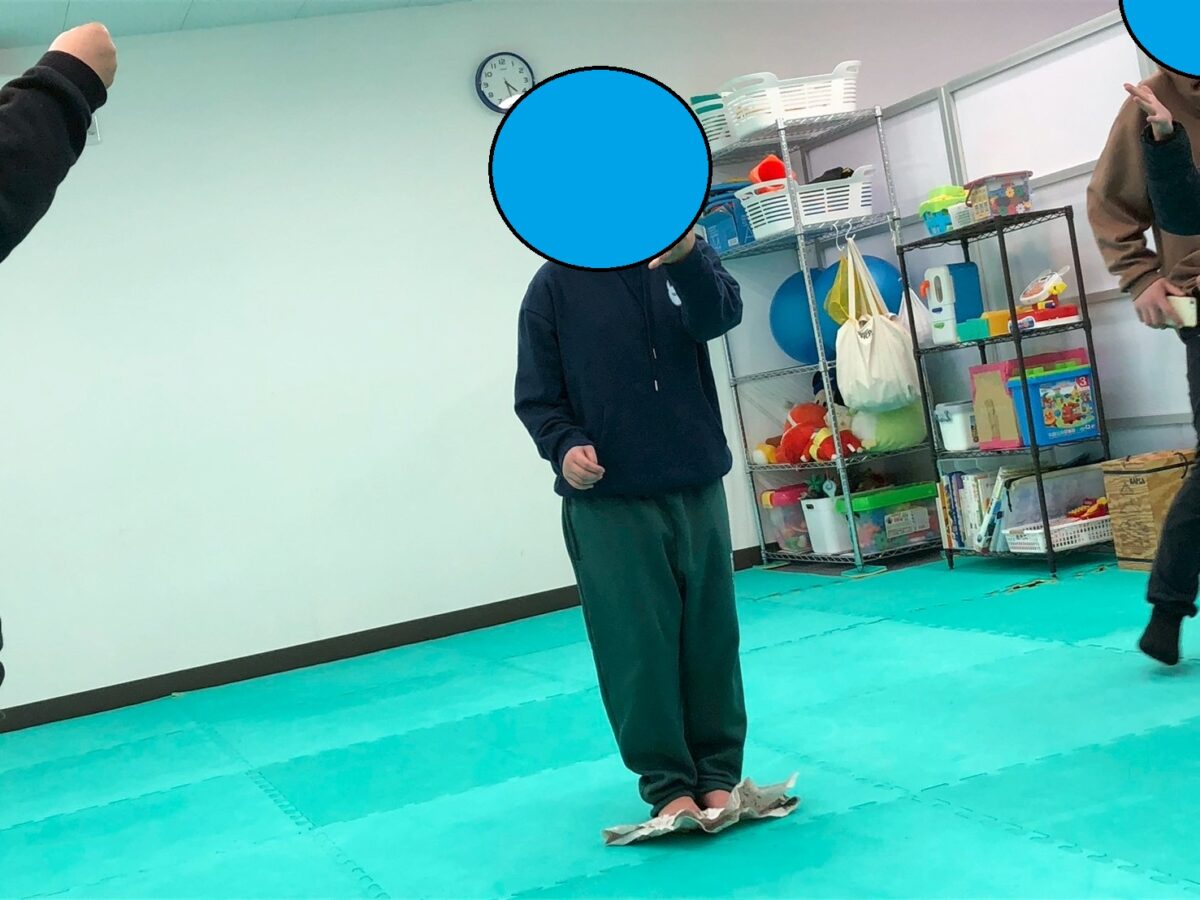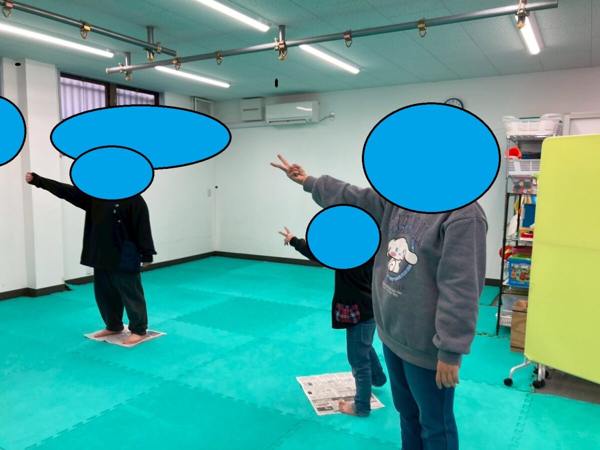 新聞の大きさに合わせて、片足立ちになったりして最後まで残れるように努力する姿が見られました”(-“”-)”