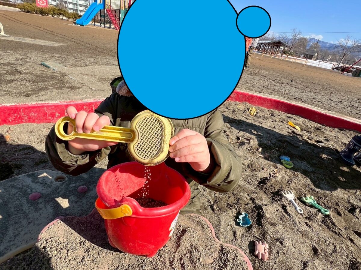 あるお友達は三角椎のおもちゃの中に砂を入れて「クレープどうぞ!」とスタッフに差し出します。