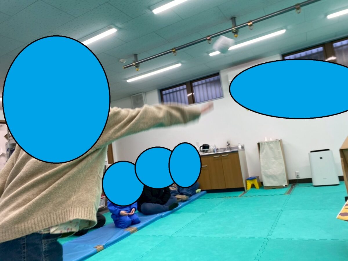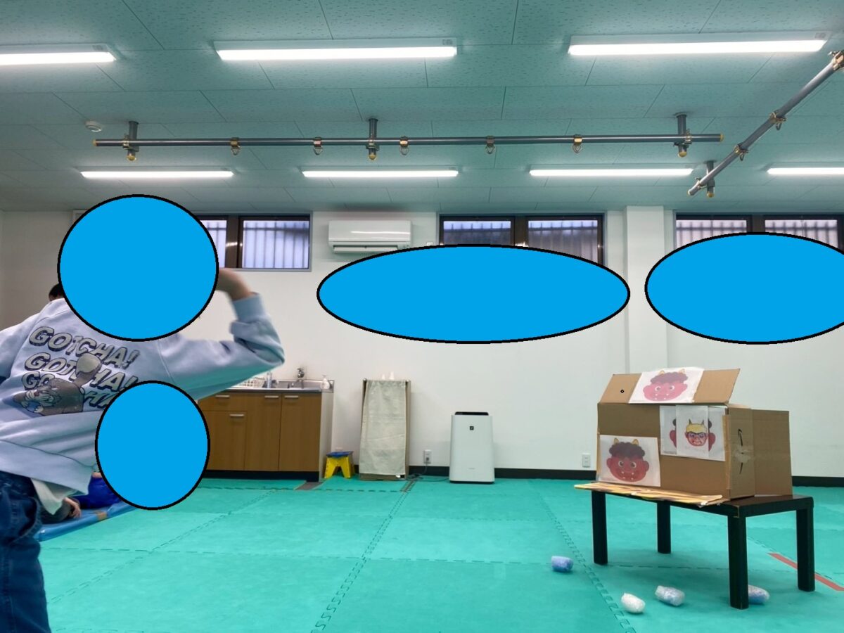 先週子どもたちに書いてもらった「自分の中にいる鬼」を的にして、制限時間まで投げる!「鬼はー外!福はー内!」と声を上げながら、鬼の退治を目指します( `ー´)ノ