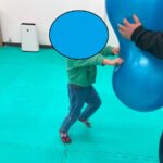 実は今週の運動あそびは「バランスボールボクシング」スタッフが持ったバランスボールにキックやパンチを繰り出していく活動です。