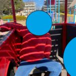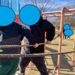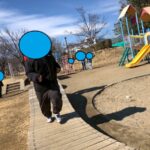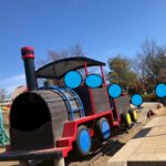 大きな複合型遊具と電車のオブジェが特徴的なこの公園。子どもたちは水筒をベンチに置くと、すぐに電車の方へ向かいました!