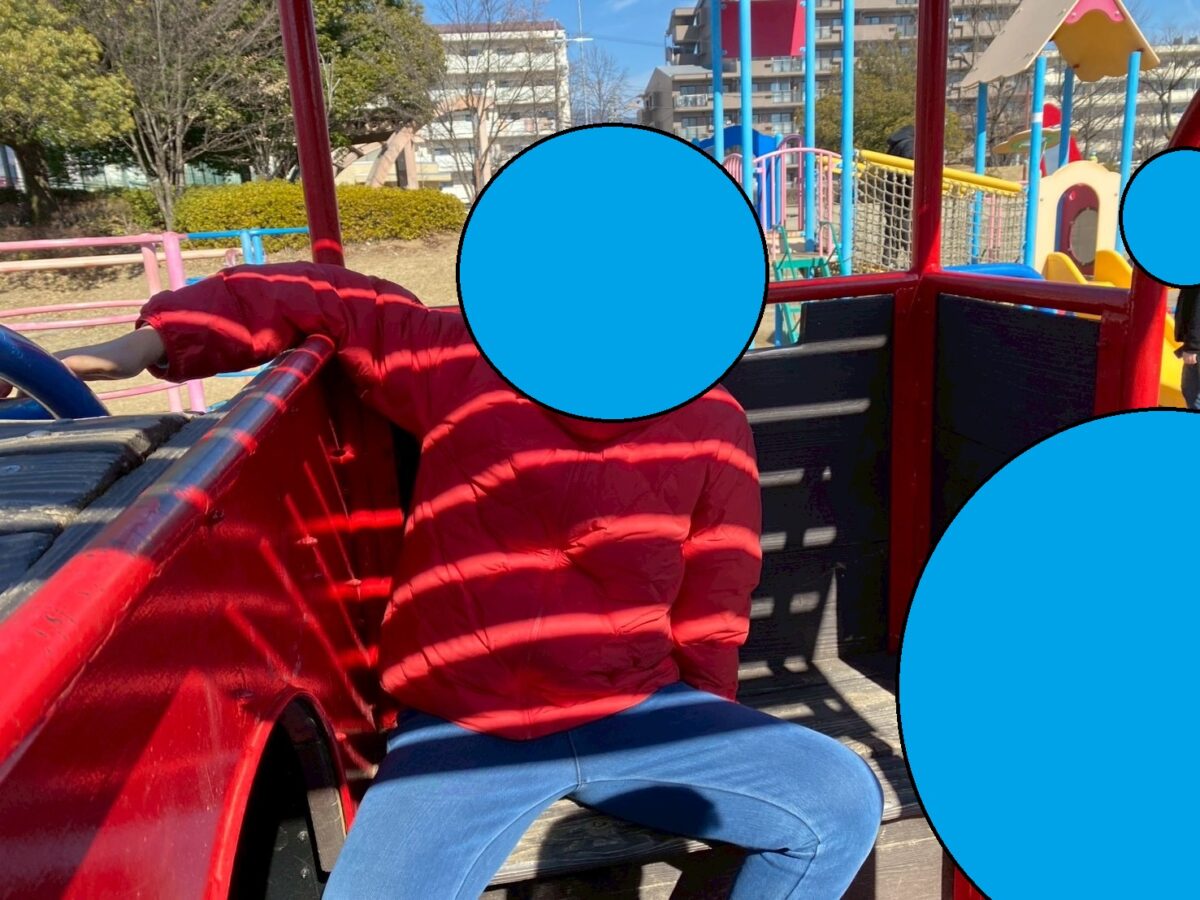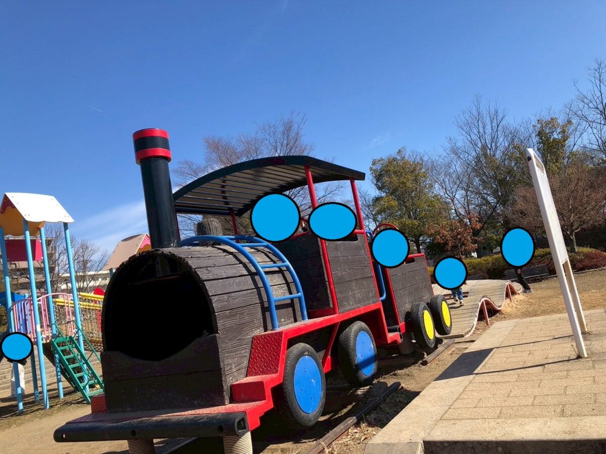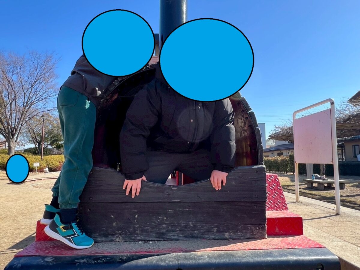 大きな複合型遊具と電車のオブジェが特徴的なこの公園。子どもたちは水筒をベンチに置くと、すぐに電車の方へ向かいました!