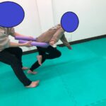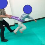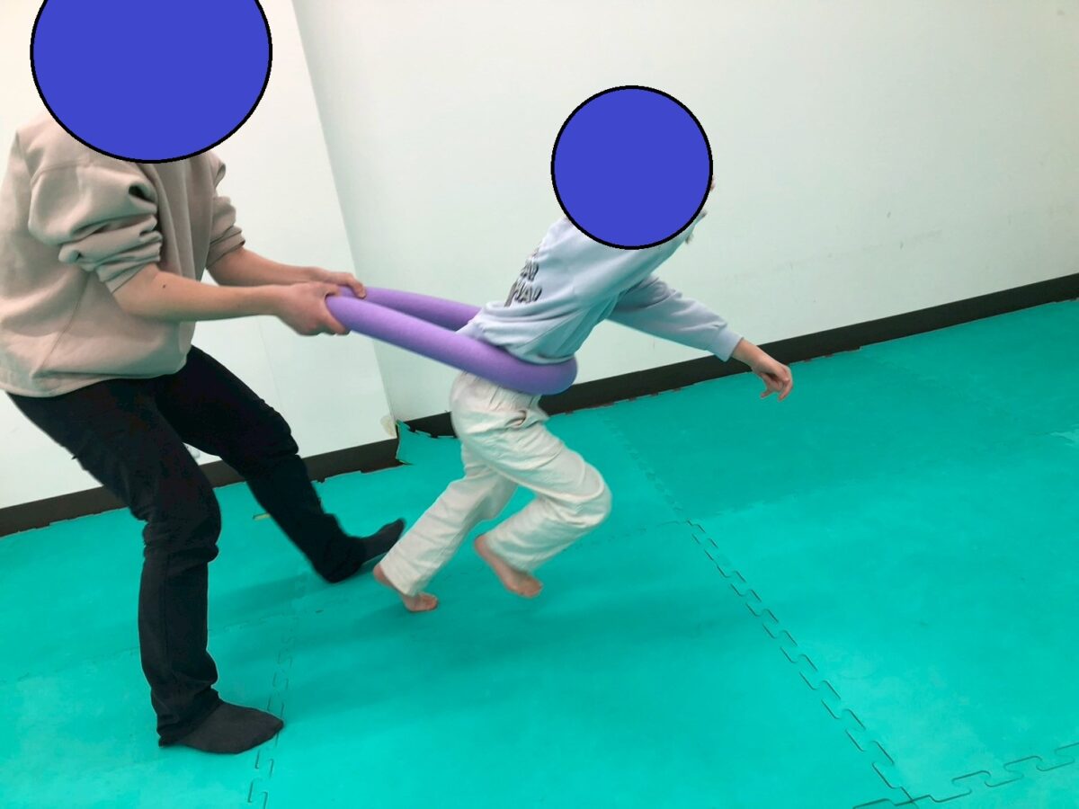 柔らかいプールスティックをお腹の前に挟み、子どもたちはダッシュ。プールスティックの両端をスタッフが持ち、前に進もうとする力に負荷をかけます。