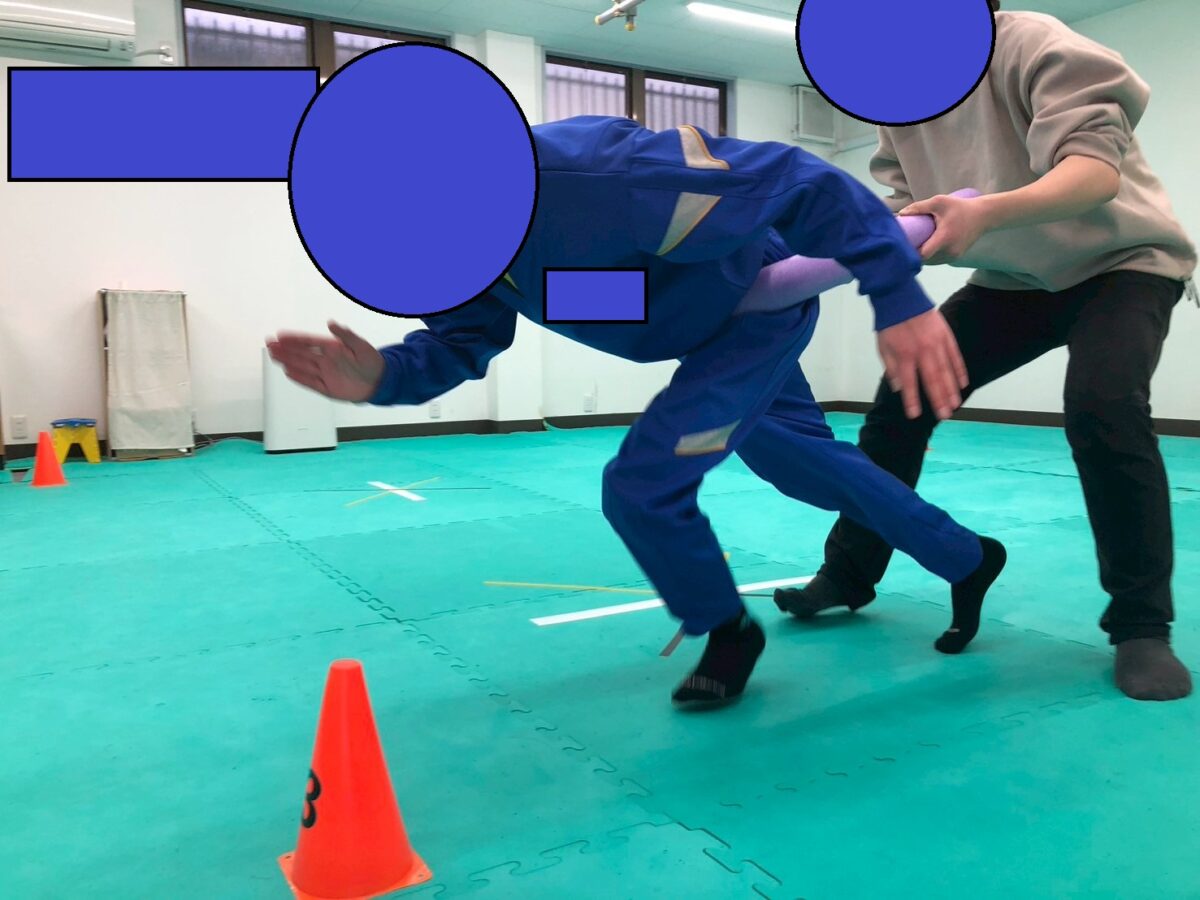 もちろんスタッフは力加減しながら負荷をかけていますが、それでも前に進むのはかなり難しい様子。