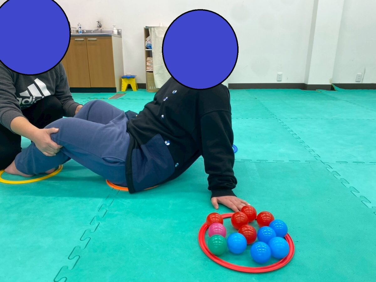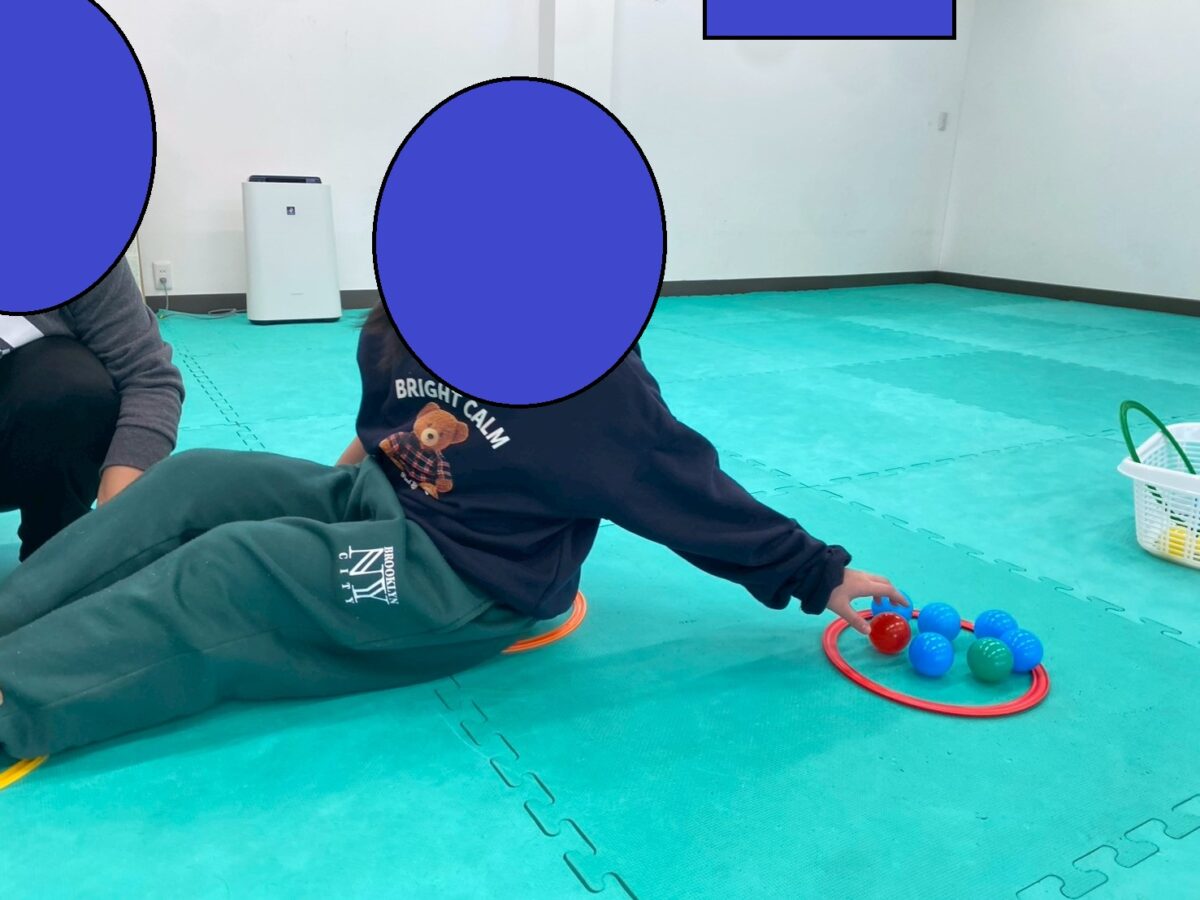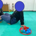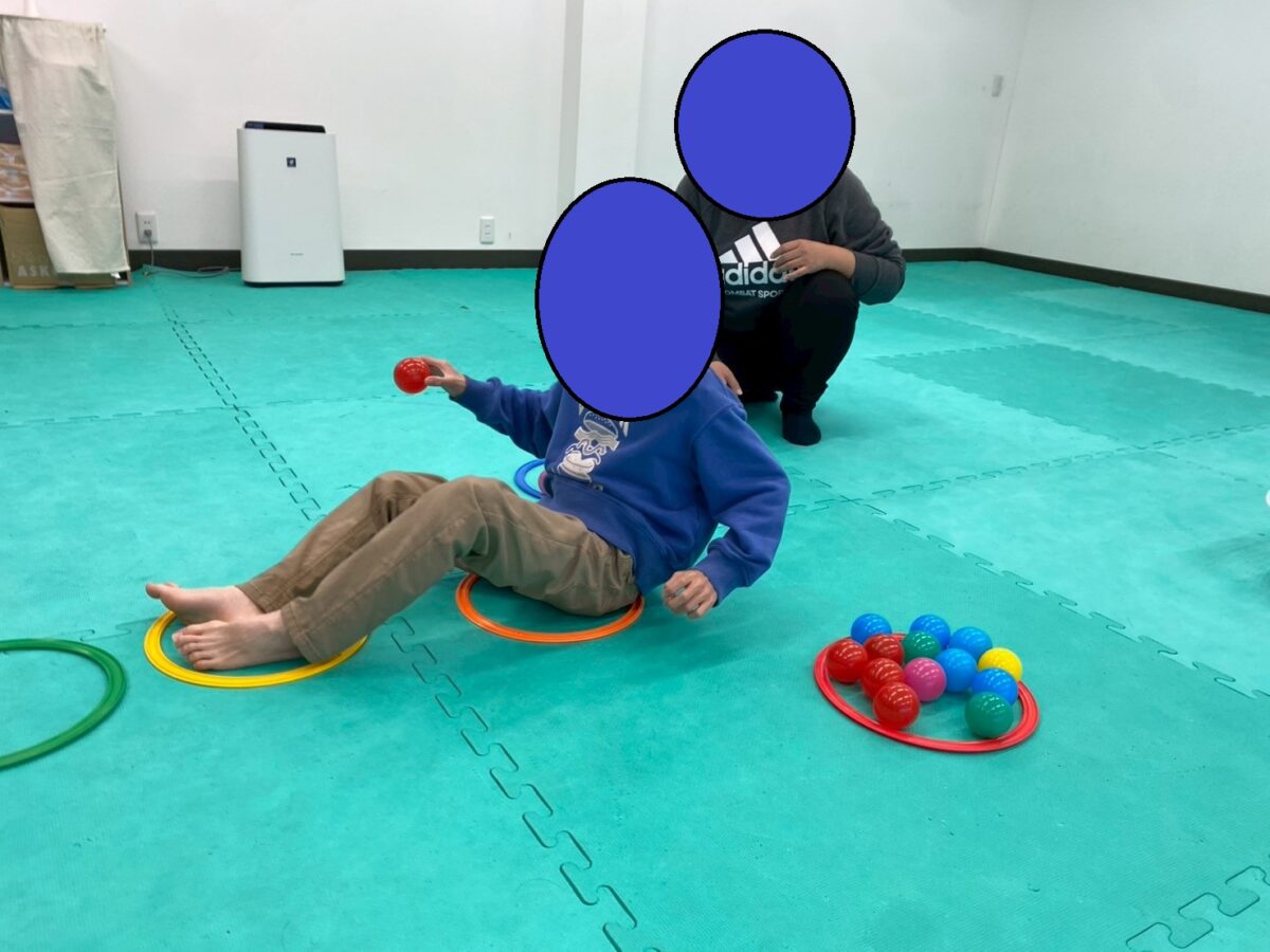 座っている自分より少し後ろの左右には赤と青のフープ。赤には青のボールが、青には赤のボールが入っています。
