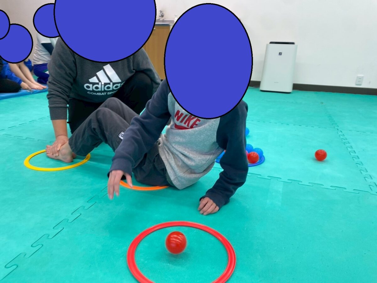 あとは赤のボールは赤のフープへ、青のボールは青のフープへ…ボールを1つずつ移動させてくだけ。足は指定されたフープから出ないように注意して…
