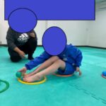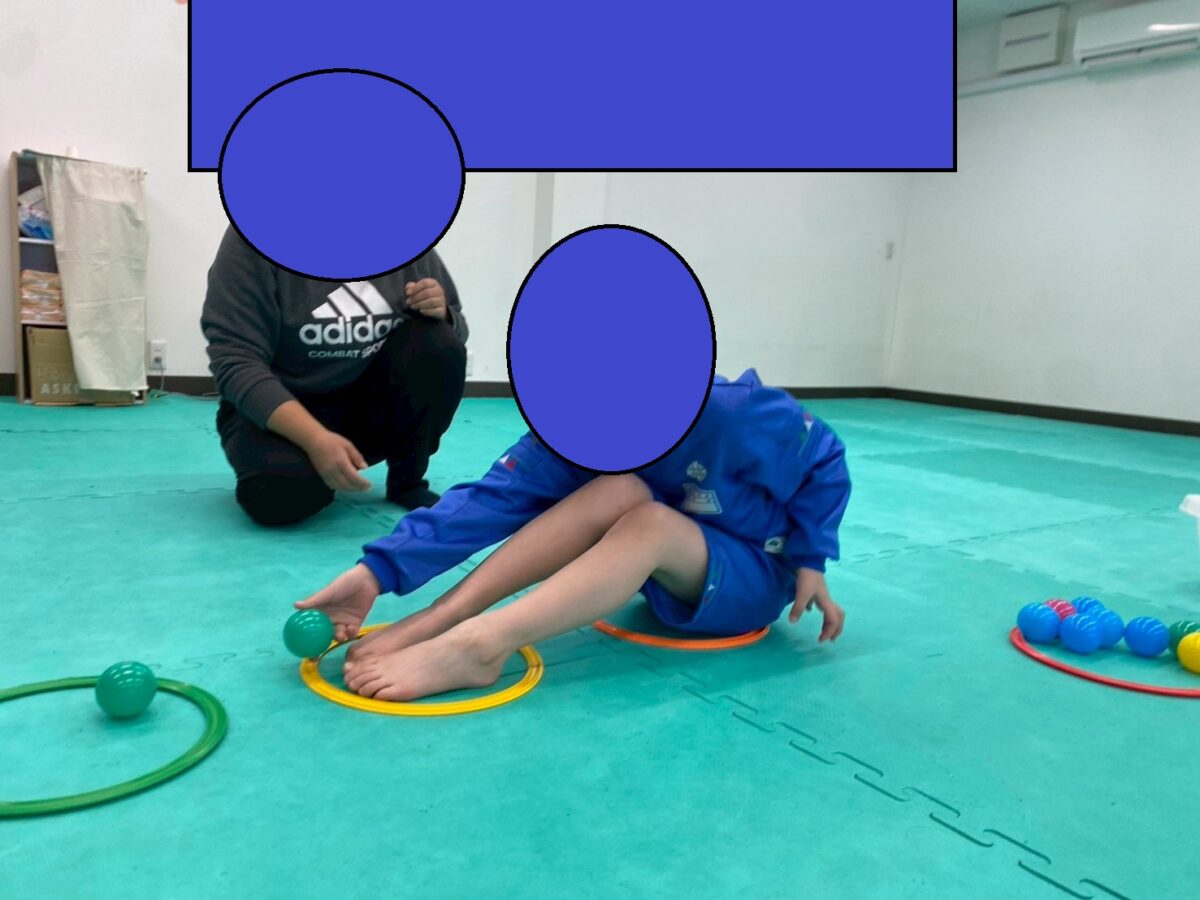 さらにできそうな子は、足の先にもフープをセット。こちらには緑色のボールを入れます。