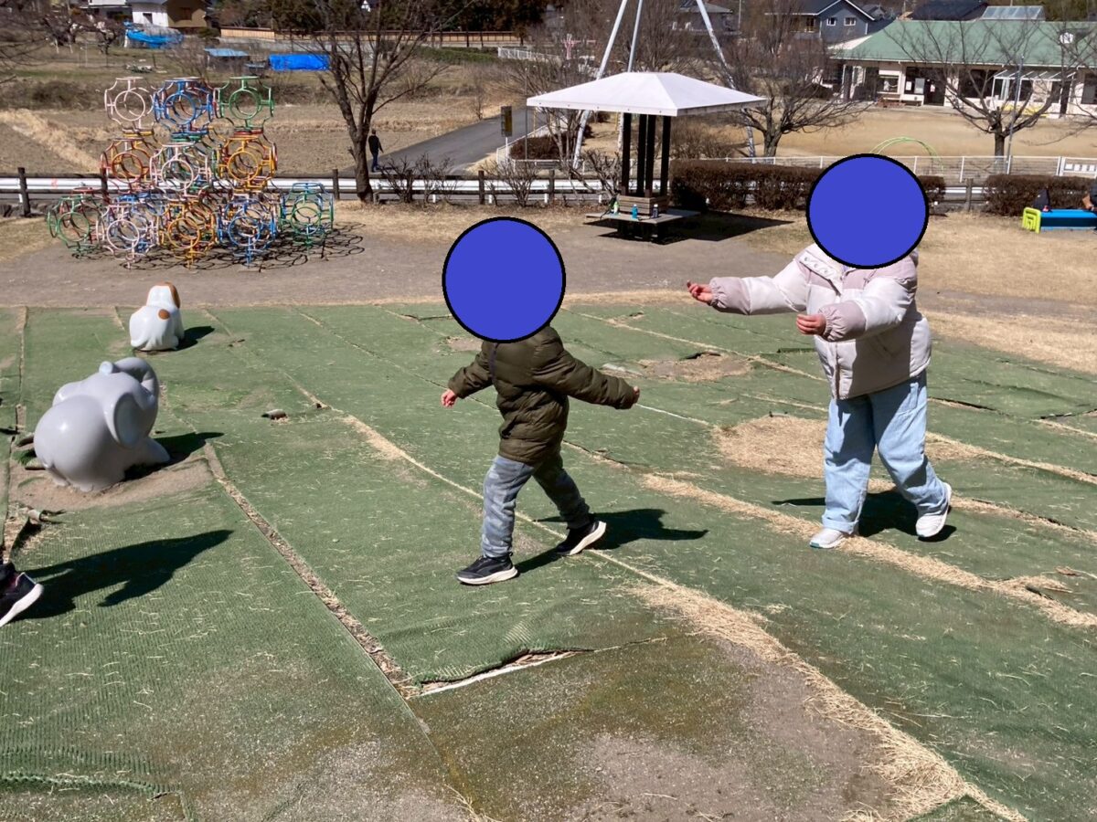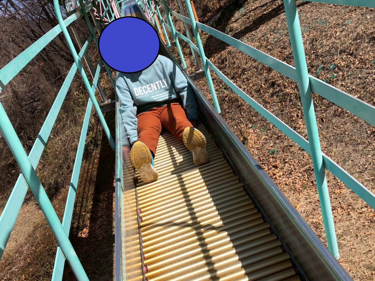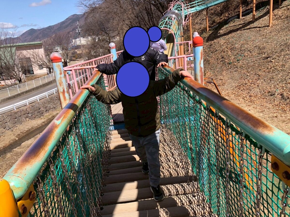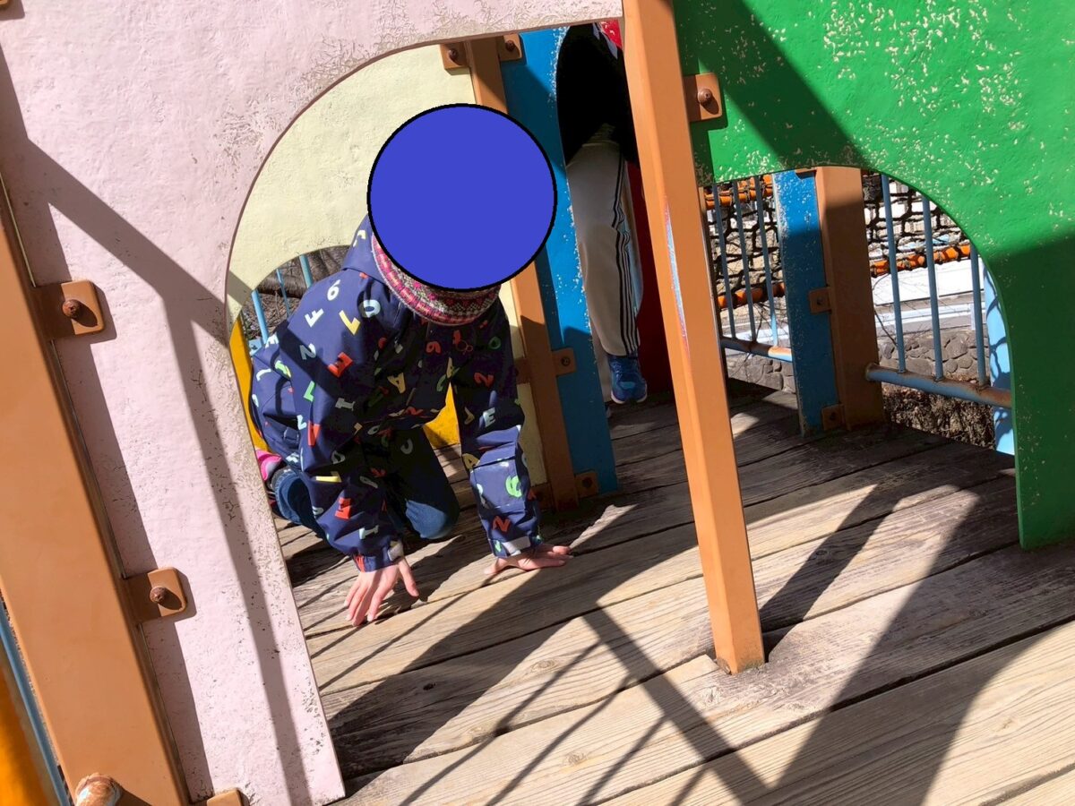 滑り降りたら、グラグラする橋を渡ったり、穴を抜けたり、おいかっけっこをしたり、ジャングルジムに登ったりして…再び滑り台へ。
