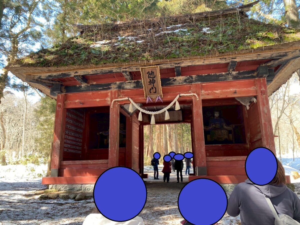 到着するとそこはまだ雪の世界。澄んだ空気の中、雪の参道を滑らないよう注意しながら進みます。