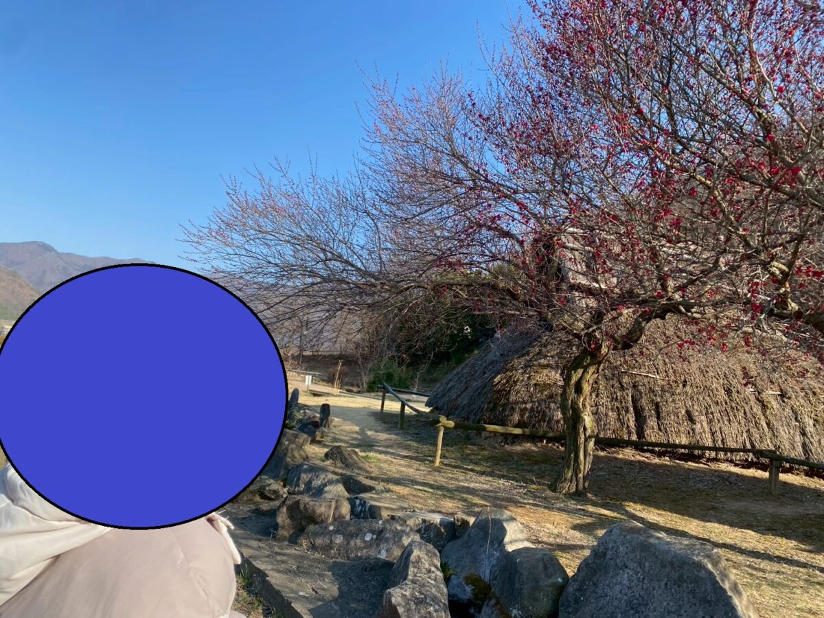 古墳から下った「科野のムラ」の竪穴住居群では、梅の花が咲いていました。
