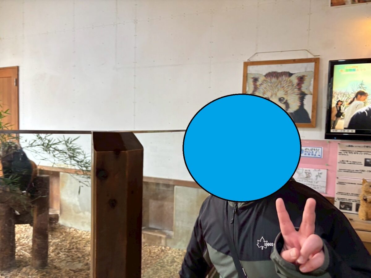 なぜかタヌキの柵には近づくことが出来たため、ピースで記念写真。