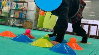 放課後等デイサービス プルプル腕を振るわせて… 今週の運動あそび、二つ目は体幹をテーマにした内容!呼ばれた子どもは輪っかの中に足を入れて、腕立て伏せの状態になります。その状態のまま、カラーコーンの色にあったボールを上にのせていき、のせ終わったら元の位置に戻す…という活動。「うっ…きつい…... 2026.01.23 放課後等デイサービス